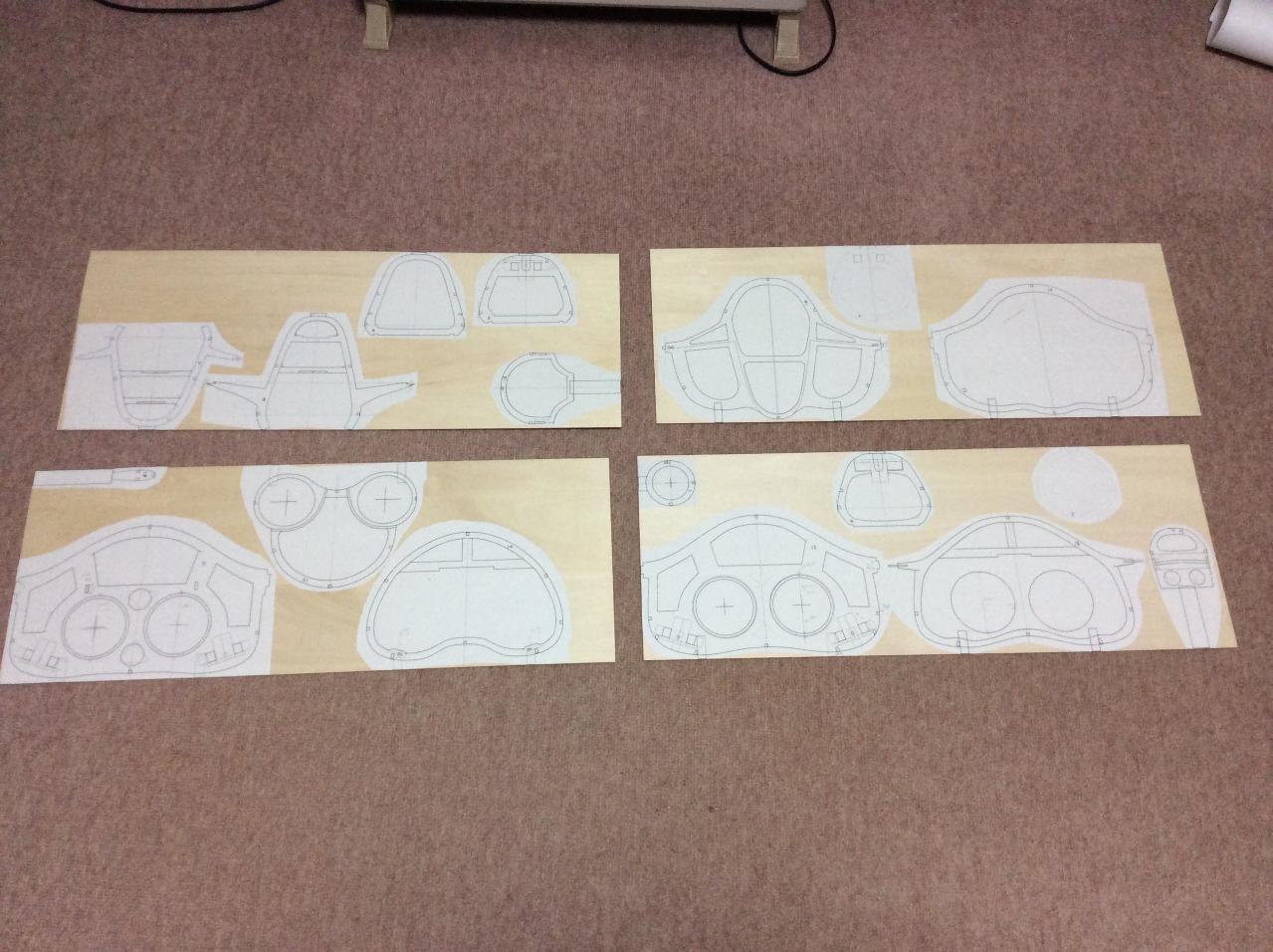 1.7mmのシナベニア(225x600mm、1枚の重さ:140g)を使いました。(2mmが手に入らなかった為)効率的な配置は別にしてこんな感じではがせるスプレーのりで貼ります。