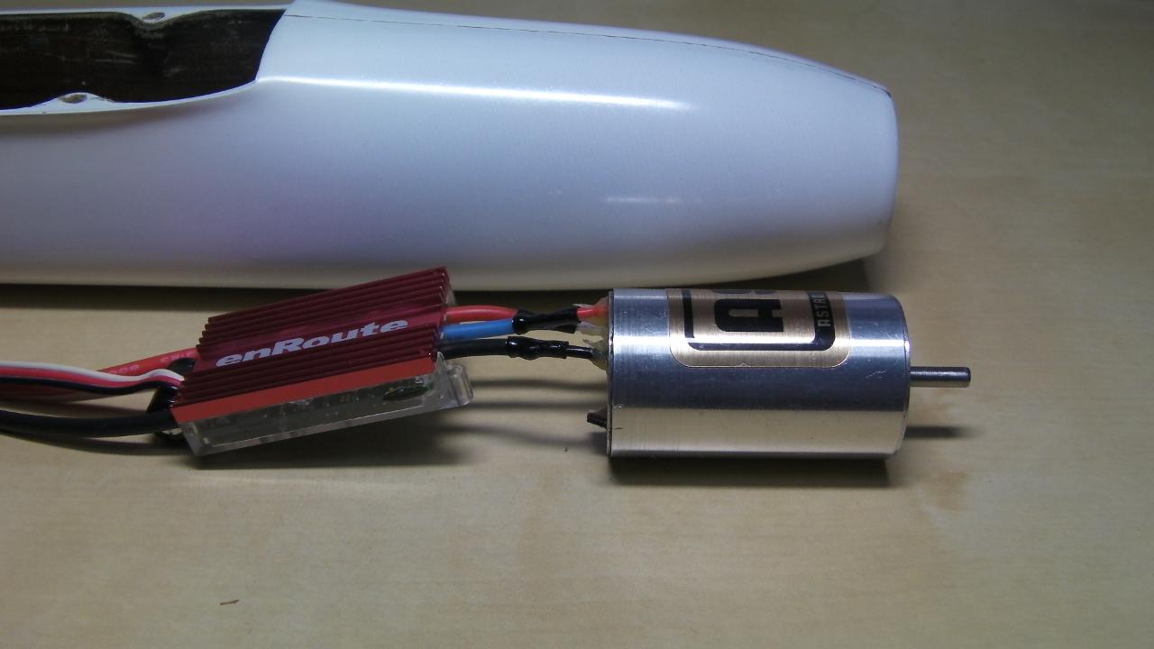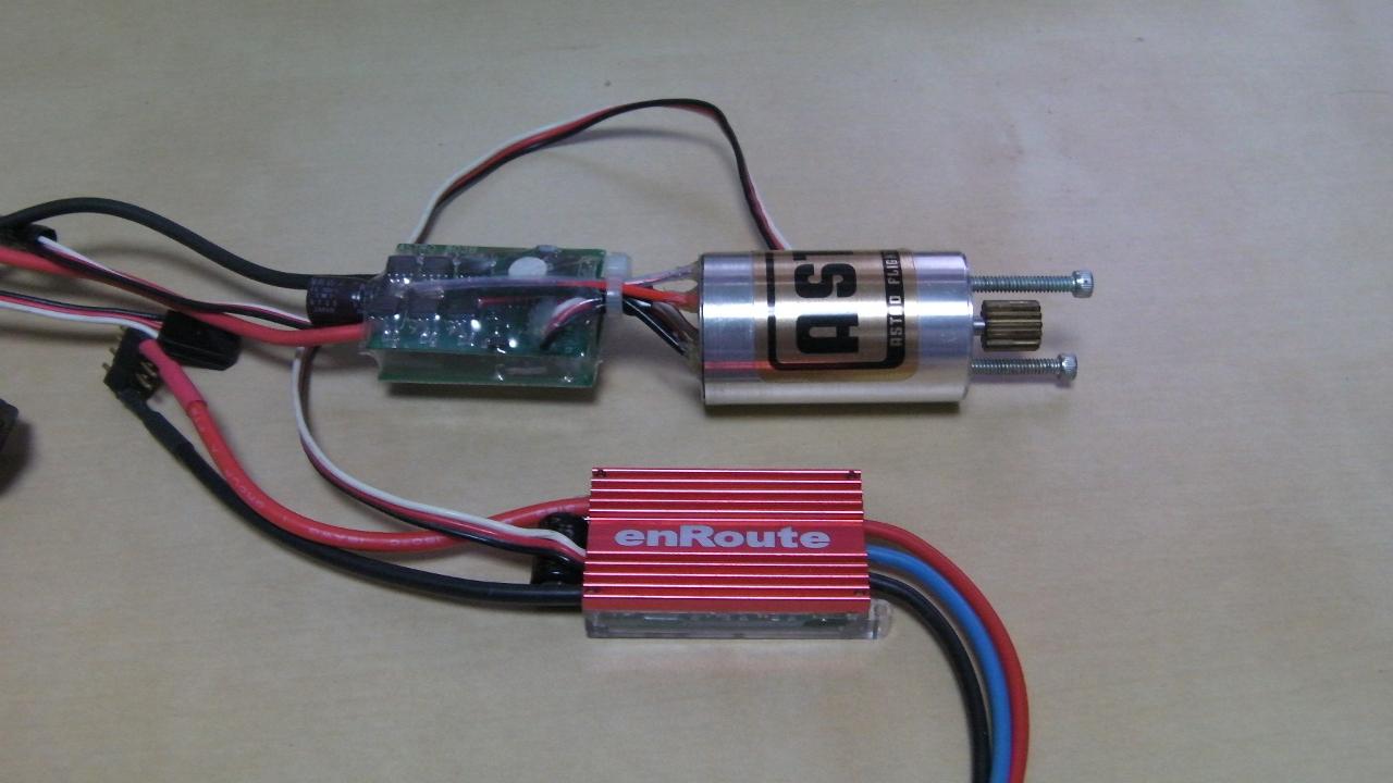 モータは昔のASTRO(アストロ)のセンサーとコントローラがセットになったブラシレスモータです。このASTROのセットはギヤダウン付きで買って逆転にしないと使えないのですが、逆転する方法がわからないので、新たに使っていないenRouteのESCを使うことにしました。センサーレスにすれば、逆転も簡単にできるので。