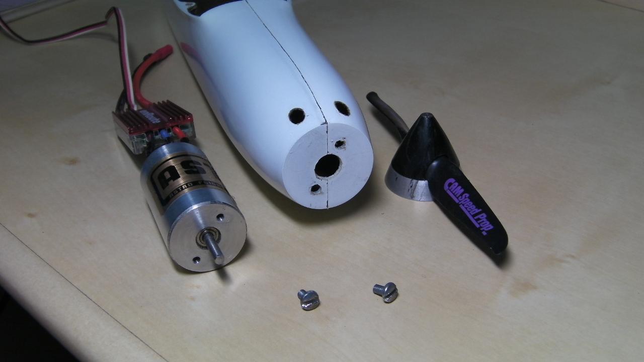 あとは、機首にねじ穴をあけ、機首上部に冷却のための穴をあけます。これで、モータとESCの冷却フィンに空気がながれるかなと思います。