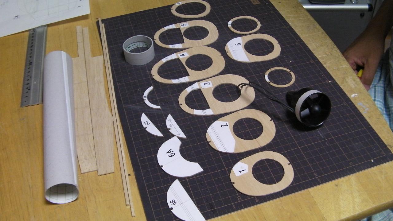 さーて、これから組み立てますが、インテークダクトを基準にして、胴枠、側板を付けていきます。胴枠の型紙は基準線となる部分と番号以外を外しておきます。