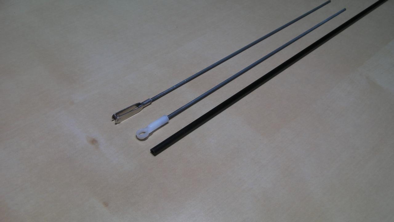 エレベータロッドは丸いカーボンパイプを使いました。サーボ側はボールリンクです。接着はロッド側に糸を巻いて、それにエポキシを付けて、カーボンパイプに挿入します。基本的には押す方向(エレベータアップ方向)に力があかかるので、最悪緩んだとしても大丈夫にとぎりぎりまでつめて、エポキシを付けています。