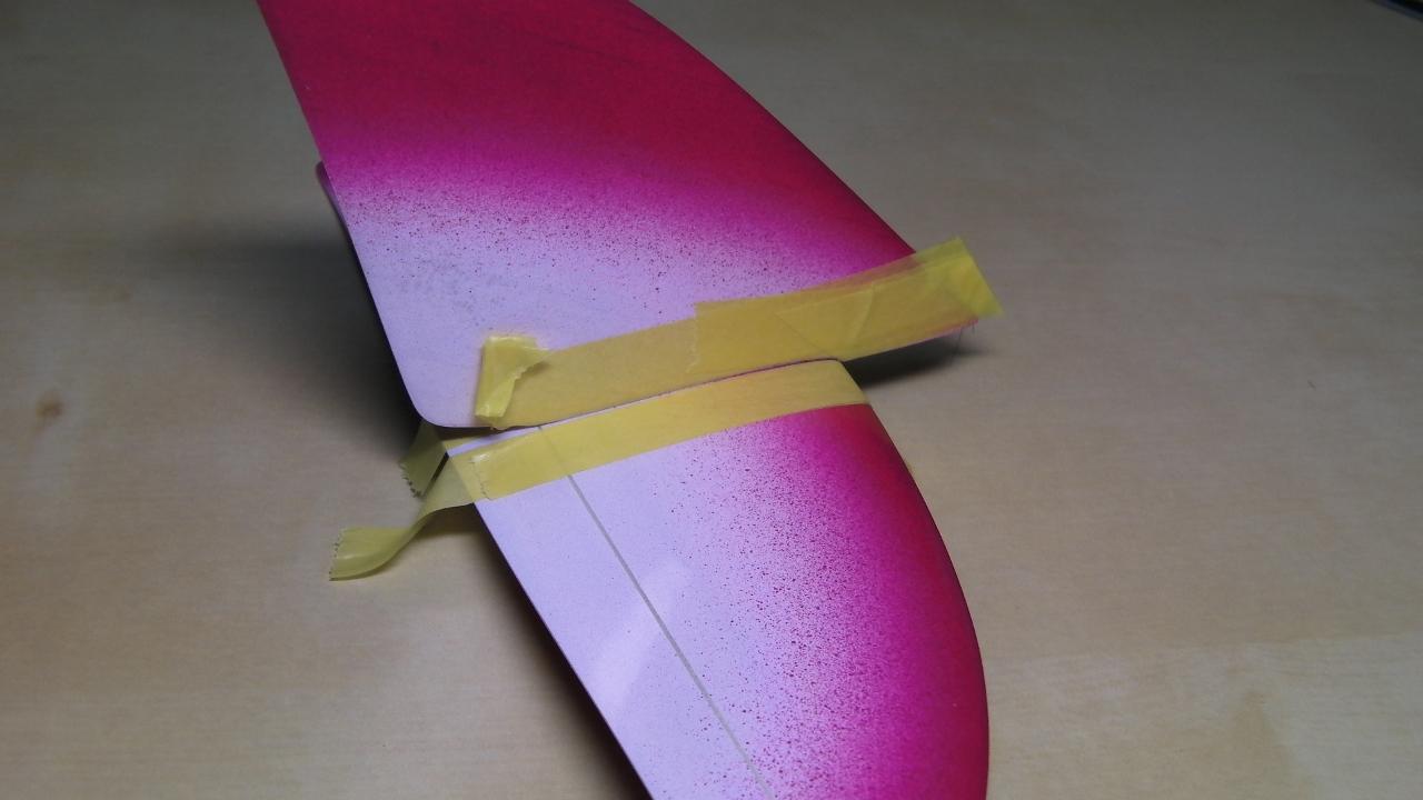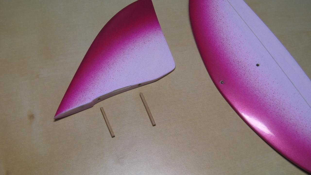 垂直尾翼と水平尾翼は丸い竹棒を使ってエポキシで接着します。