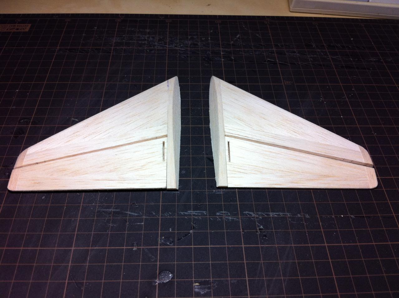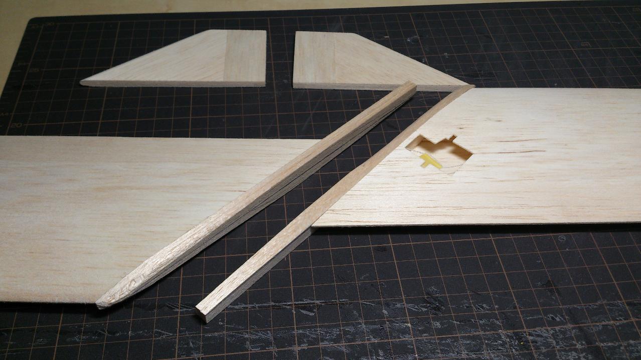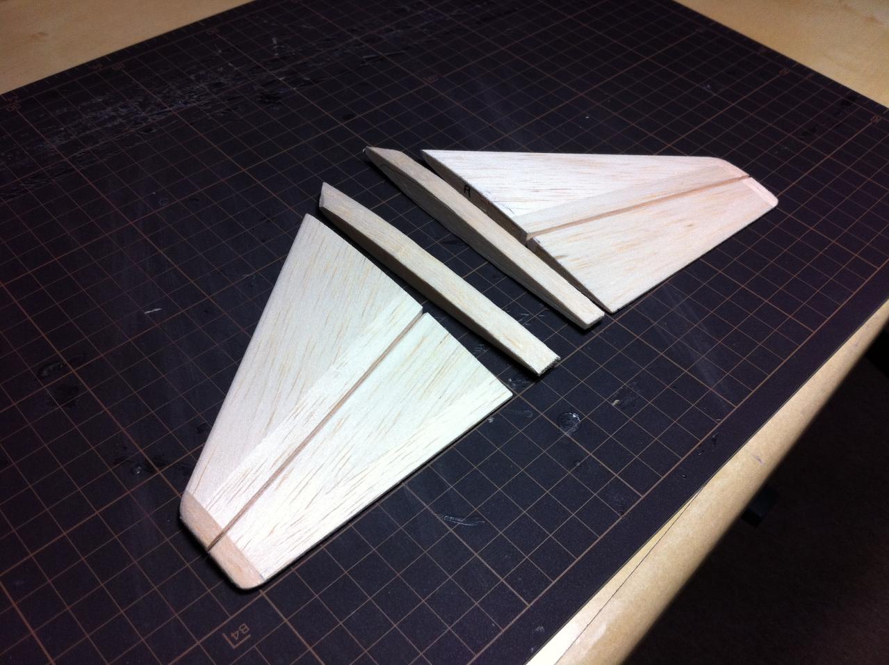 主翼に対して水平尾翼に下反角を付ける為にの部品をバルサで作成します。