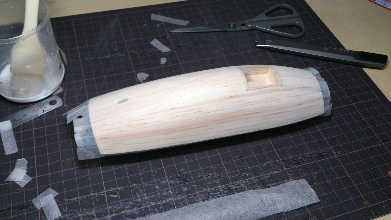 胴体は甲板貼りの要領と同じにペタペタと貼っていきます。