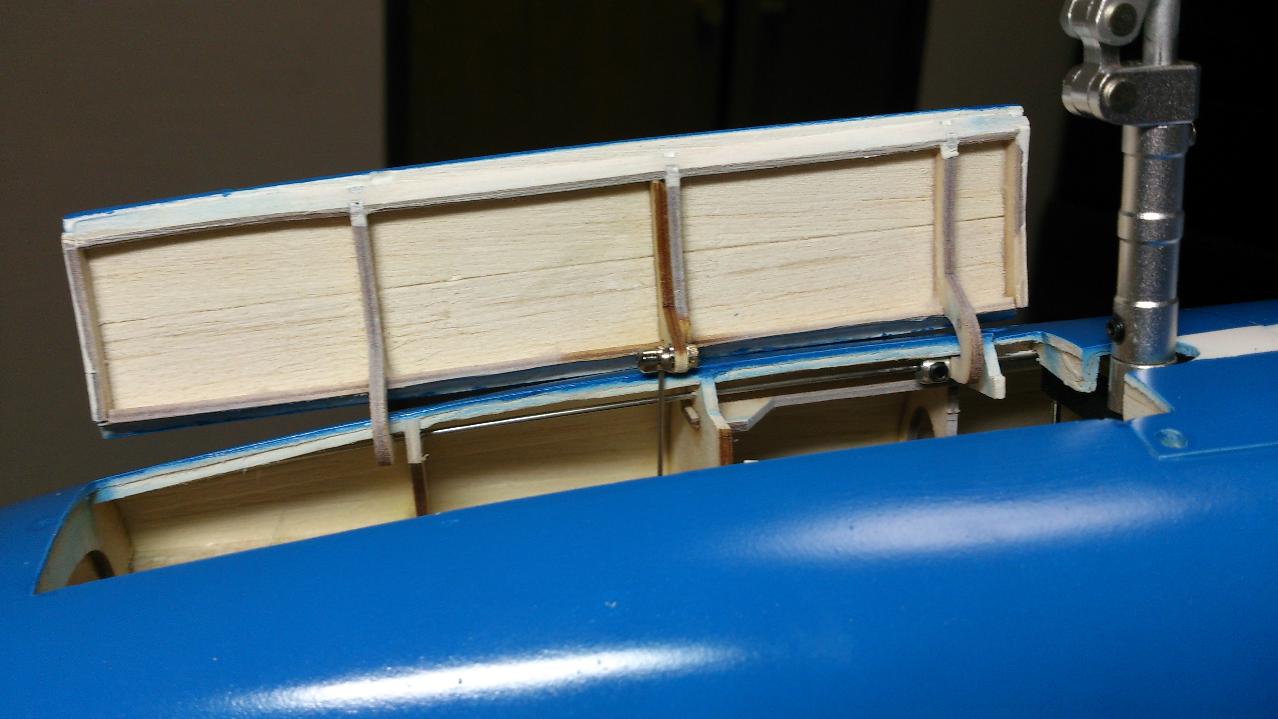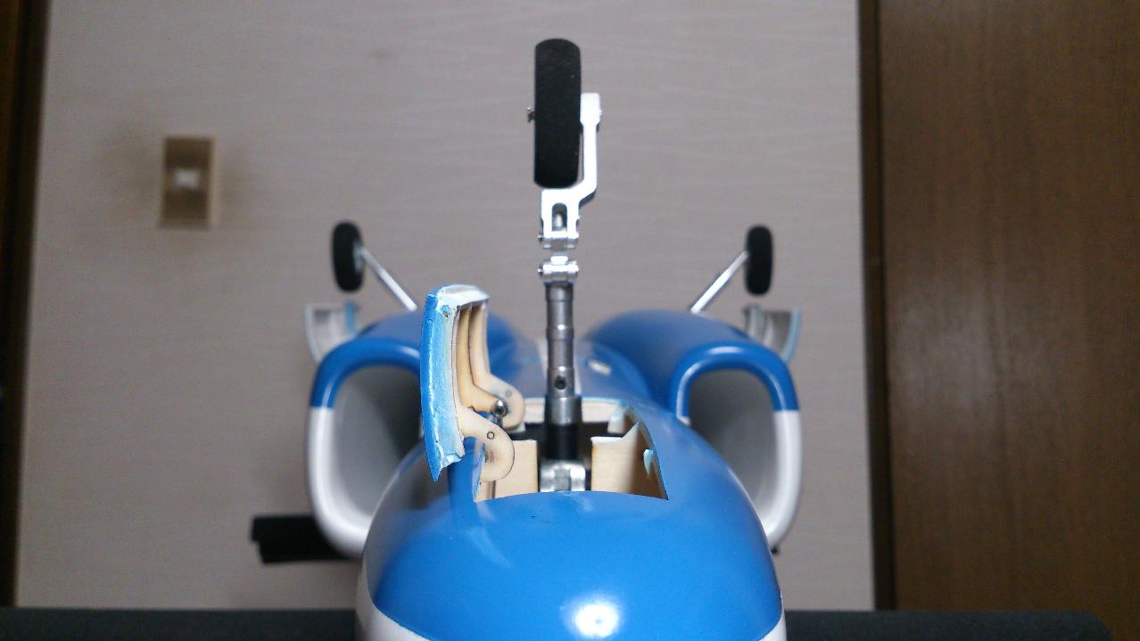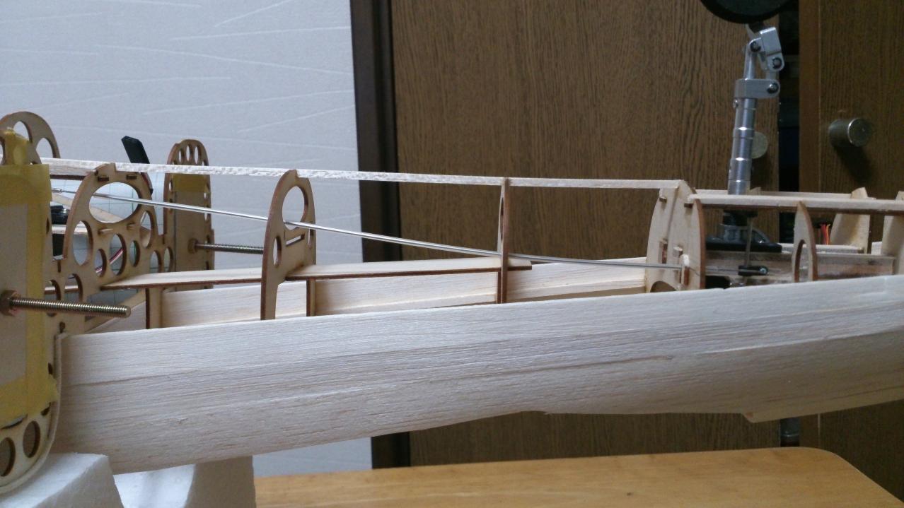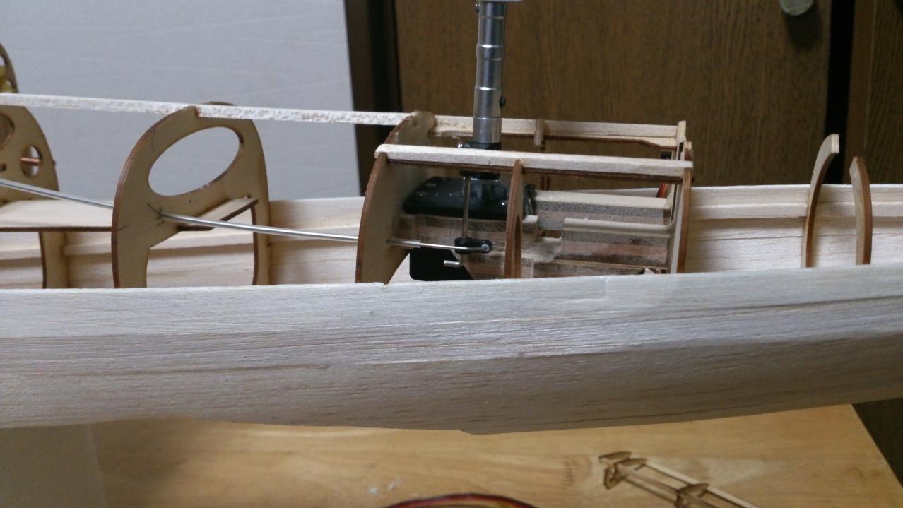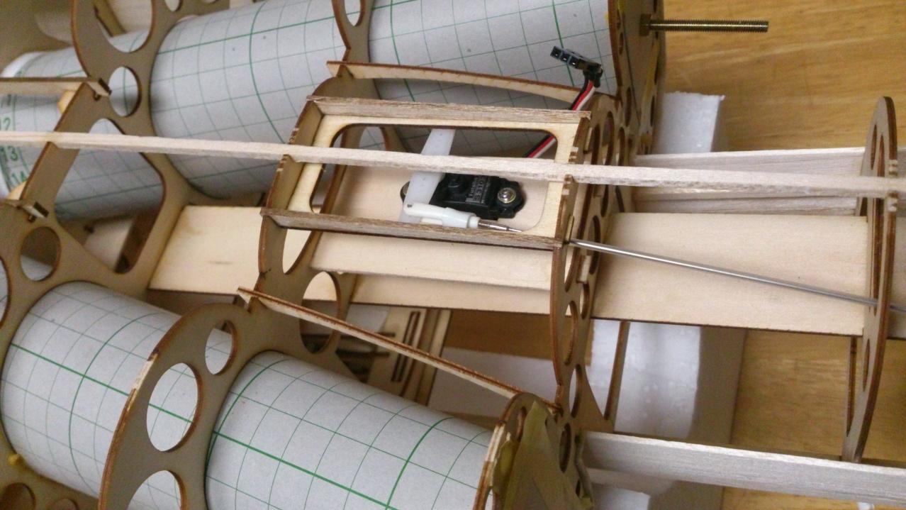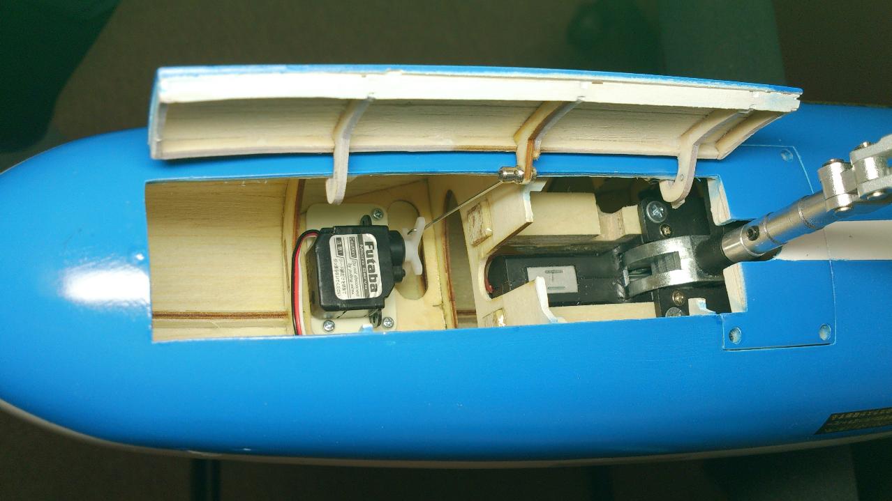 プランク前にノーズ・ステアリング(ラダー)リンケージを済ませておきます。ノーズギアは機首方向(通常の逆)に引き込みますので、ラダー・ステアリングへのロッドが逆に(写真は左から)になります。ですので、ロッド先がラダー・ステアリングのバー(ピアノ線)をまたぐようになっています。