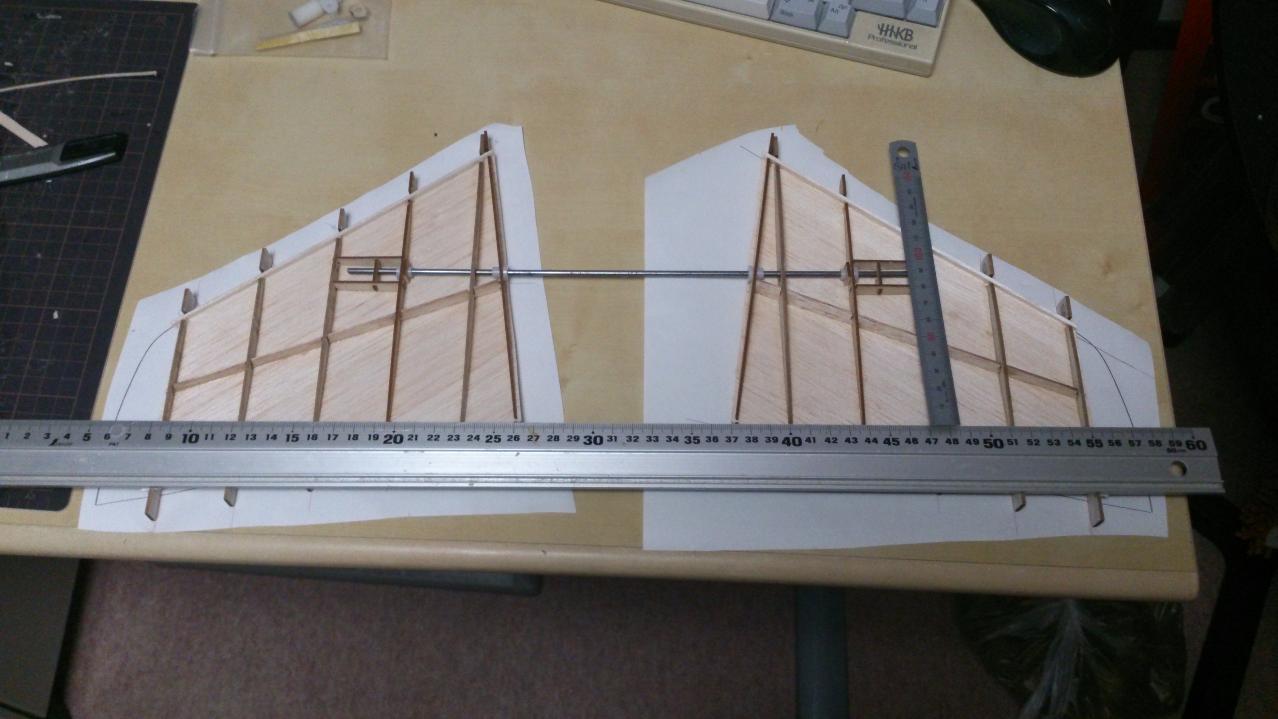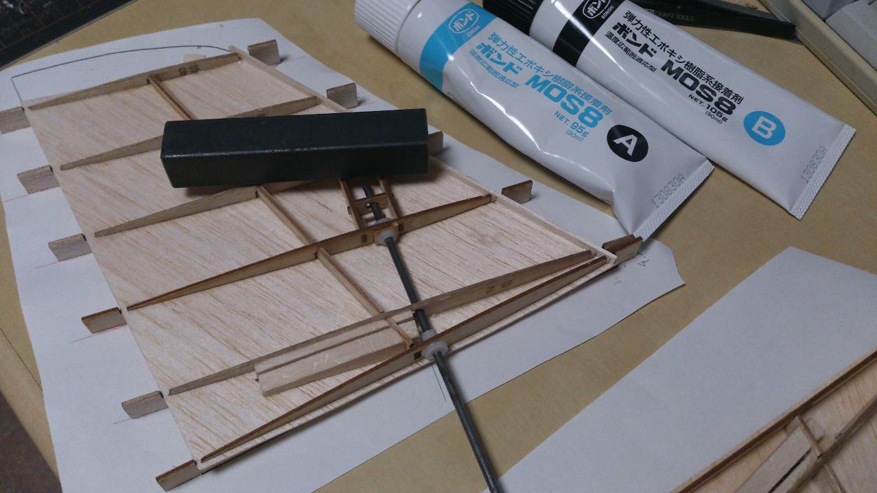 垂直尾翼と同様にプランク材(1mmソフトSSバルサ)、治具を使って組み立てていきます。