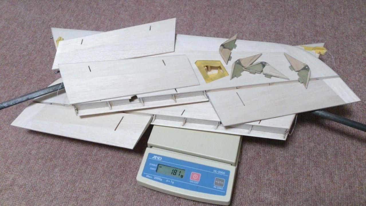 主翼181g(メンテナンスハッチ4個を忘れて入れていません。+4gぐらいでしょうか)