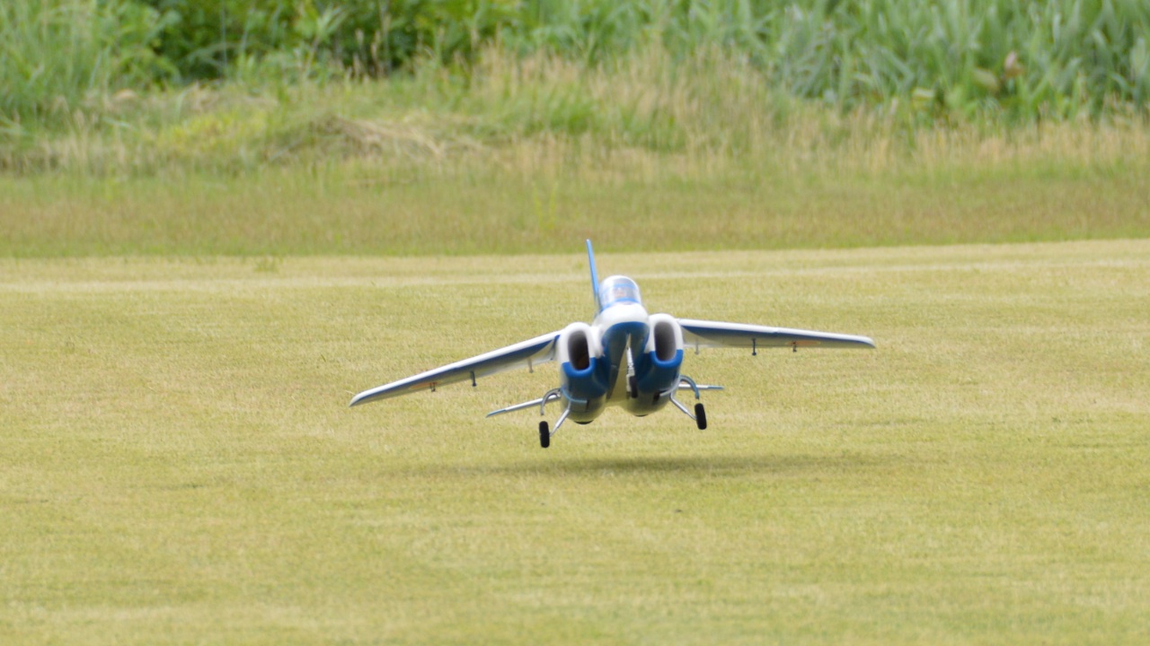 気になっていたギヤドアですが、フライト前の滑走テストで、メインギヤのイモネジが緩んで、壊してしまい急遽修理しての初フライトでした。既に1号機の初フライトが済んでいましたので、そのデータ(重心位置、各蛇角、ミキシング)をそのまま設定してのフライトです。