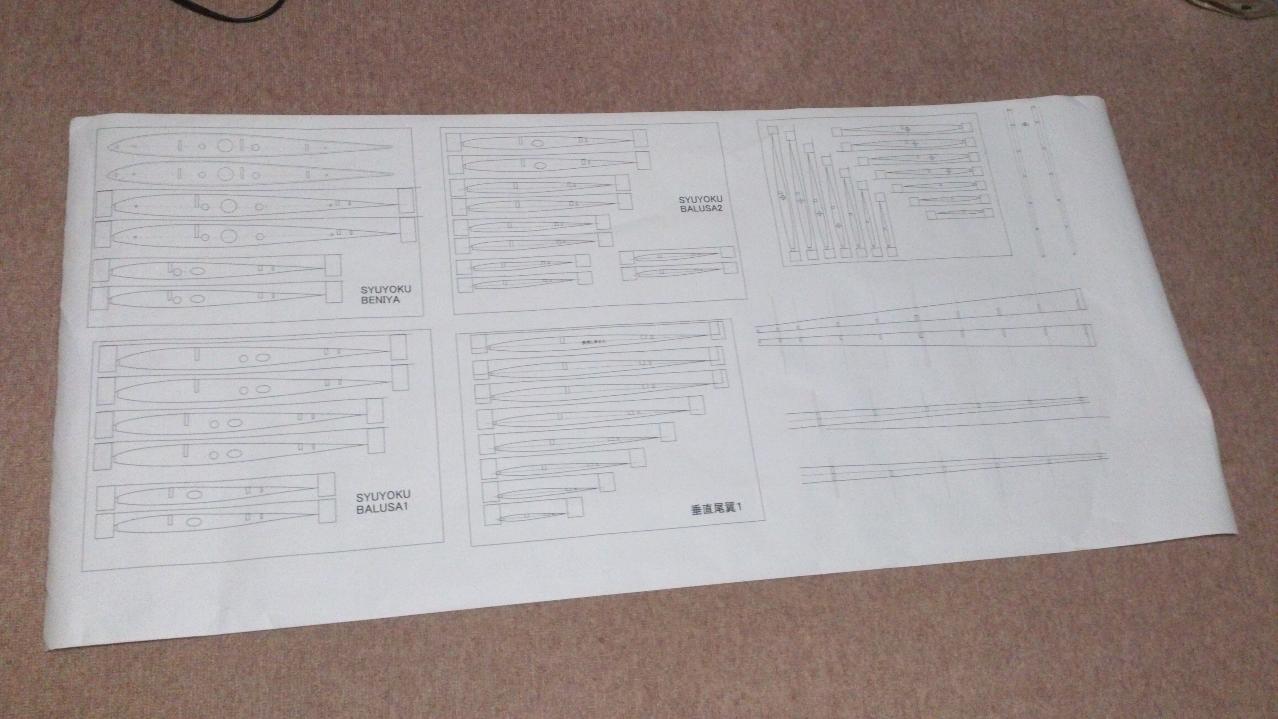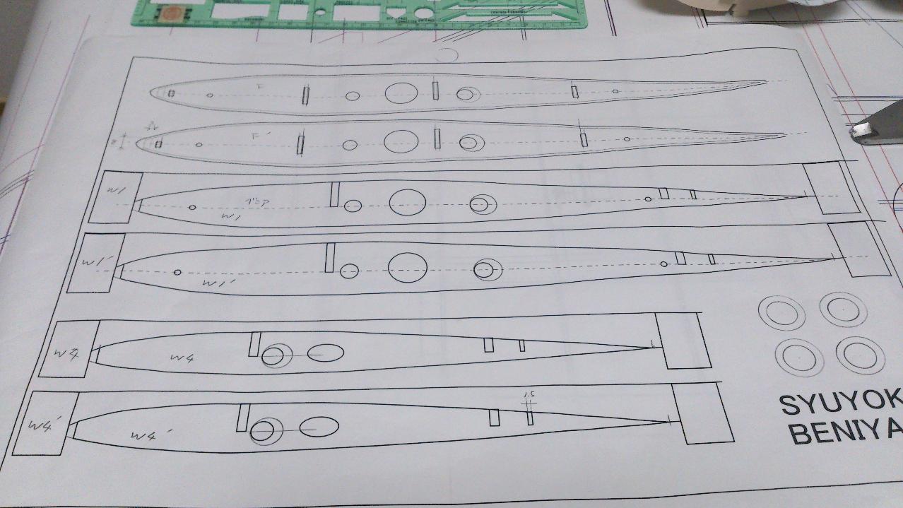 注意点ですが、主翼のジグ部分ですが、型紙ははがさず残しておきます。あとで主翼を組み立てる為にジグを図面上に固定するのですが、基準となる線がジグ部分にあるのでそれに合わせます。私はできたーぞ!と気持ち良ーくはがしてしまい、あとから基準線を書くはめになりました。