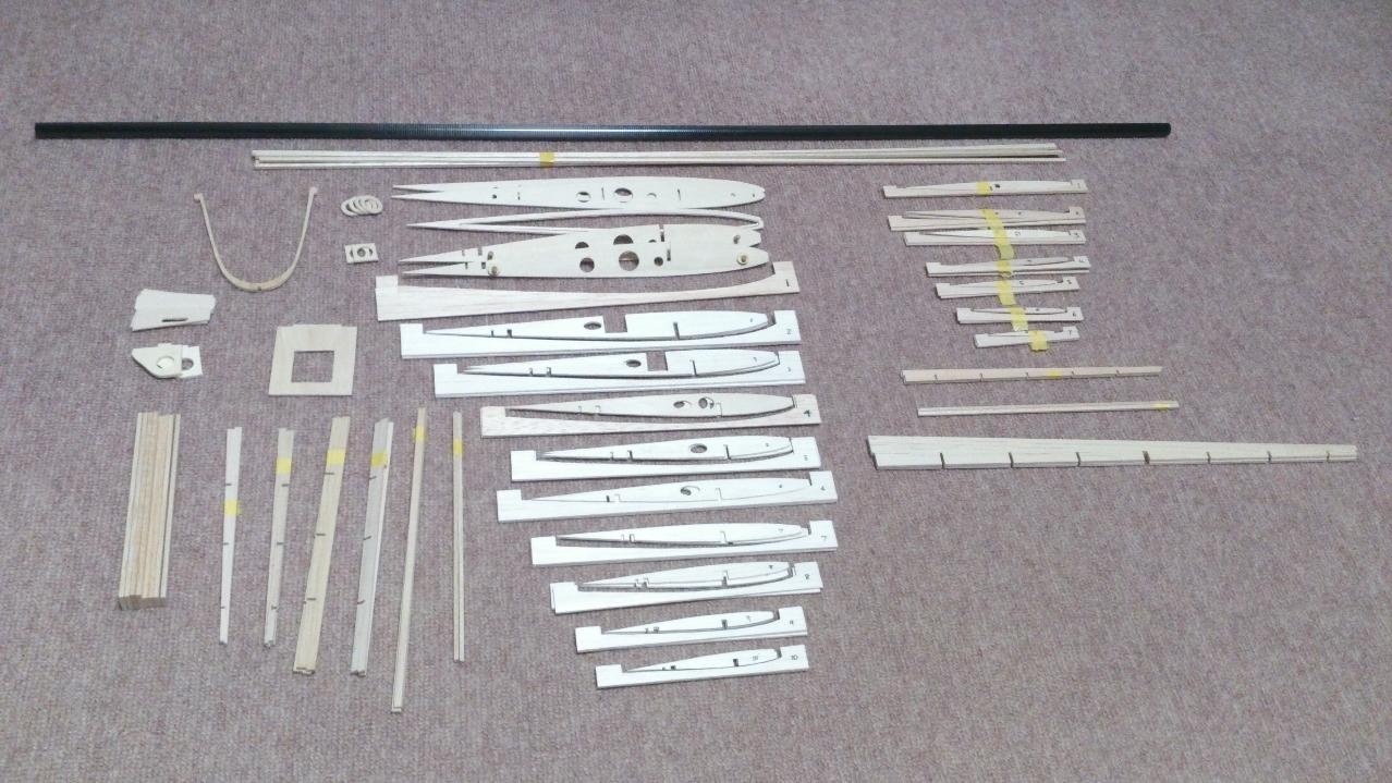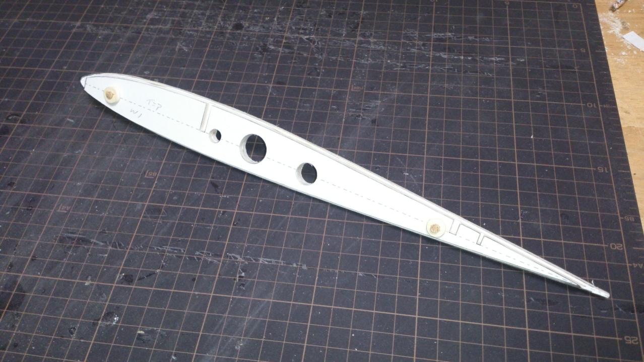 主翼のリブはベニア(1.7mm)とバルサ(2mm)、水平リブは1.5mm、垂直リブは一番下(大きい)が2mm,その他は1.5mmとしました。