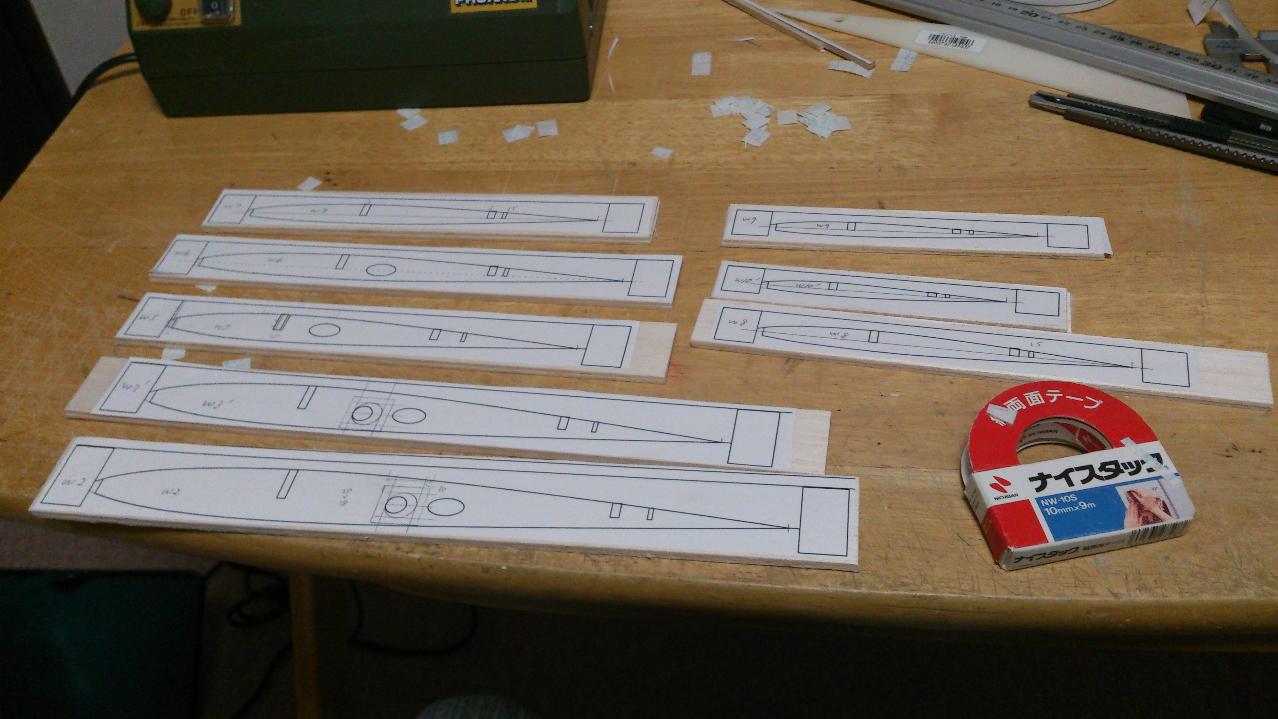 同じリブを2枚を両面テープで付け、型紙をはがせるスプレーので貼り付け、糸ノコできります。