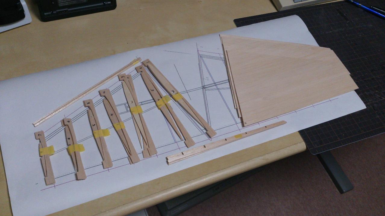 水平尾翼を作成するためのバルサのリブ(厚さ1.5mm)、ベニアのリブ(1.7mm)、スパー(厚さ2mm)、プランク材(1mm)を切り出します。図面も水平尾翼部分だけのものがあります。