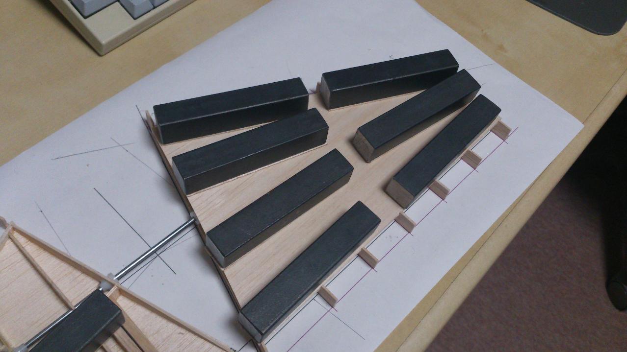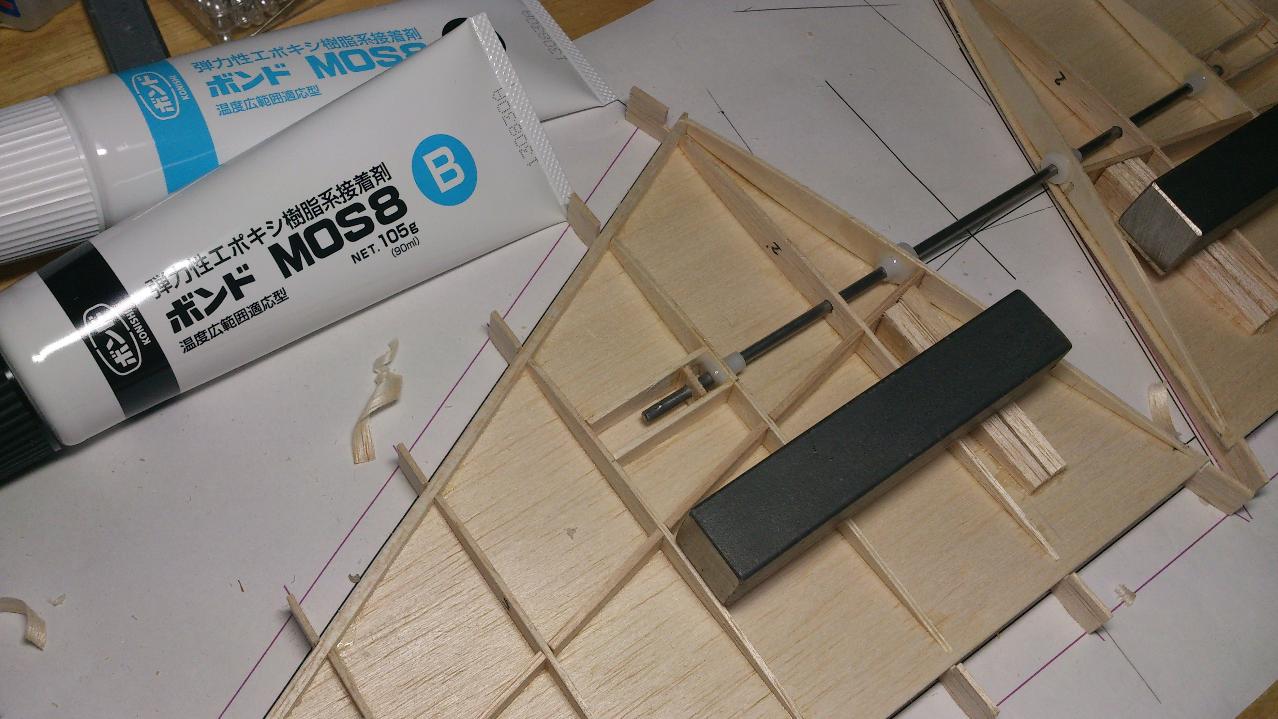 ストッパー部とエレベータホーン取り付け部を作成していおいて、ピアノ線とリブとの接合部品は弾力性エポキシ樹脂系接着材ボンドMOS8を使って接着します。